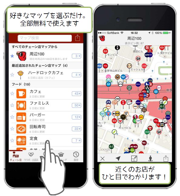 特に魅力的なのが、ユーザーの現在地を中心に周辺施設を一覧で地図に表示してくれる点。「Googleマップでも同じようなことできるんじゃないの?」と思われがちですが、ロケスマは使いやすさと表示スピードの点で優れているため、リピーターも多いんです。